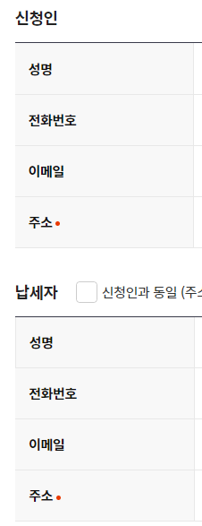 신청인, 납세자 정보를 확인합니다. 동일하면 신청인과 동일에 체크를 합니다.