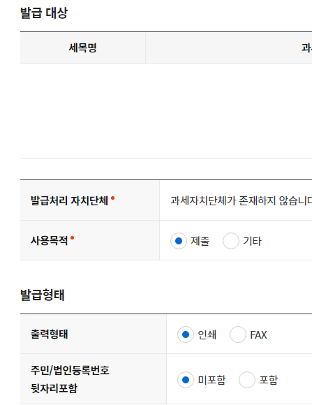 발급 대상, 발급형태를 입력한 후 발급신청하시면 됩니다.